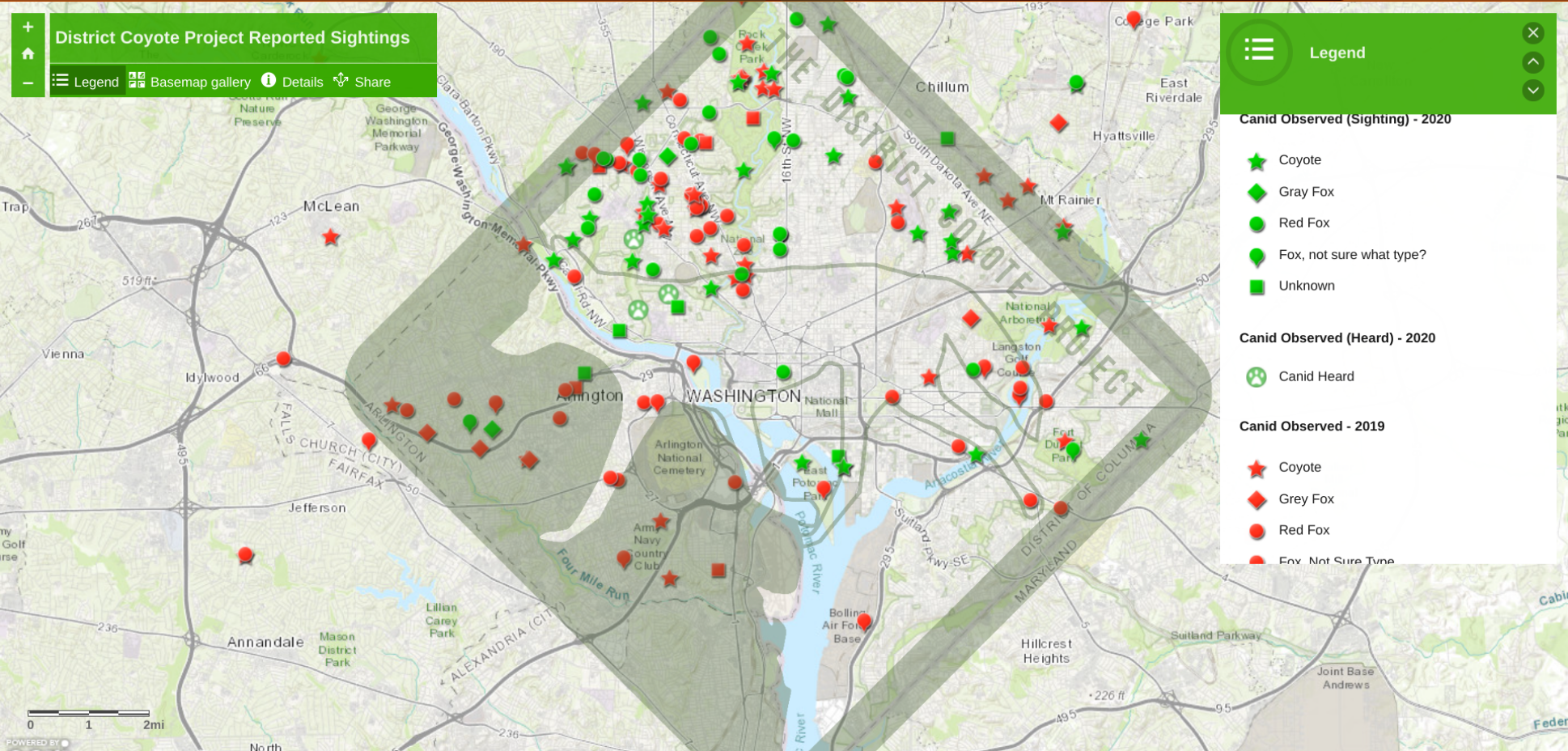 Part of our research relies on community science and receiving reports of coyote and fox encounters and sightings around the DMV region.